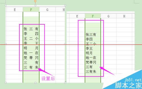 7、设置前后,大家可以对比下图,可以看出设置后人名的排列更美观,而且也不再需要我们一个个二字人名以空格来增加间距了,一步实现二字人名的排版,更好提升工作效率。