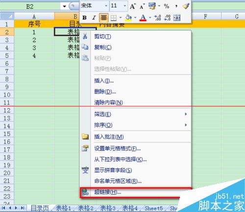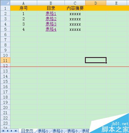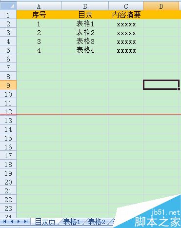 4、修改插入页名称为目录页,在目录页中根据需要编辑一个目录,一般包括:序号、每页表格页名称、内容摘要等信息。
