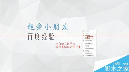 3、在ppt空白处或者需要粘贴文字的位置单击右键,选择【粘贴】。在粘贴里有几个选项按钮,选择那个图片按钮,功能是将复制的内容以图片的形式粘贴进去。