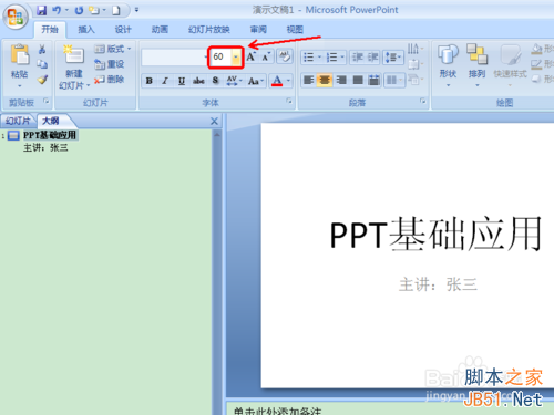 如果觉得字体不够大,可以调整字体大小。比如,要调整“PPT基础应用”字体大小。用鼠标框选“PPT基础应用”,框选后可看到该字体背景变暗了。调整字号,比如调整为“60”。
