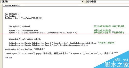 在Word的编辑过程中,Word虽然有自带的自动保存功能,但在工作中常遇到Word突然崩溃或损坏,使文件无法打开,之前的工作付之一炬,如没有备份文件只能从头开始。 利用VBA代码,实现自动备份功能,不需要认为的操作,使Word每隔几分钟可以自动备份,而不影响正在编辑的文件。