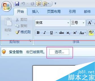 5、保存代码及文件,且关闭word并重新打开,重新打开点击【选项】-> 【启用此内容】,如图: