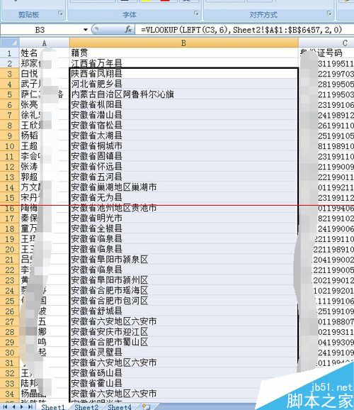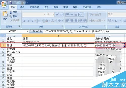 5、最后我们来输入公式,查找对应的籍贯。“=VLOOKUP(LEFT(C3,6),Sheet2!$A$1:$B$6457,2,0)”