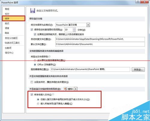 3、【选项】窗口中,左侧找到【保存】,点击该项,右侧窗口最下面一个可选功能是“将字体嵌入文件”,勾选前面的复选框。