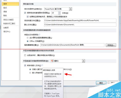 4、在“将文字嵌入文件”下方有两个选项,分别说一下
