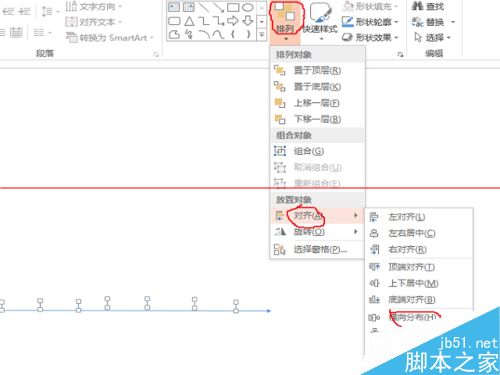 7、继续选择所有的刻度线,然后选择上方的<排列>-<对齐>,然后先选择横向分布,如下图,这下X轴就完成了,在刻度下输入合适的文字即可。