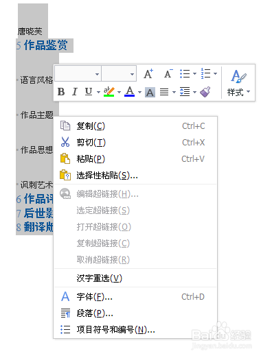 3、有时候复制过后,不小心双击空白处或者其它操作,取消了按钮,可以选择要改变格式的文字,单击右键,会出现下图