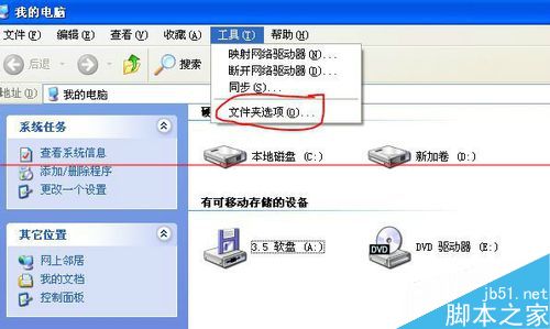 1、双击“我的电脑”--->工具---->文件夹选项,其实任意一个文件夹下的菜单都有这个选项