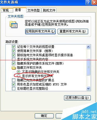 2、点击“查看”页签,找到“隐藏文件和文件夹”选项,将其属性设置为“显示所有文件和文件夹”然后确定。