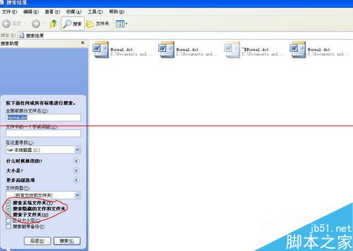 4、如果实在找不到,“开始”--->“搜索”,然后在左侧选择“所有文件和文件夹”,出现下图,在“全部或部分文件名”内输入“Normal.dot”,记得把下方的三个选择框都勾上,不然搜索不出来