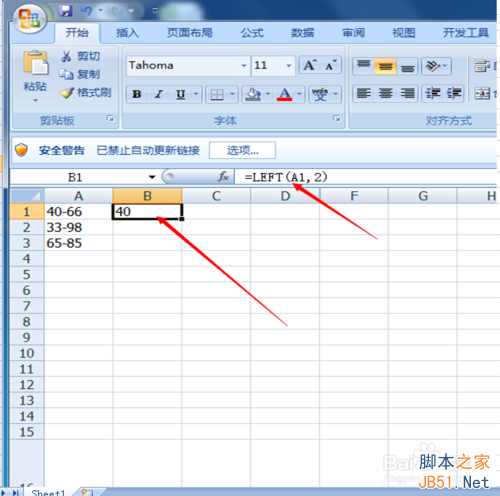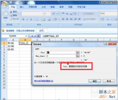 3.由第二步操作公式后,我们得出来下面的结果如图, A1单元格中从左数2位字符是40就像我们看到的确实就是40。