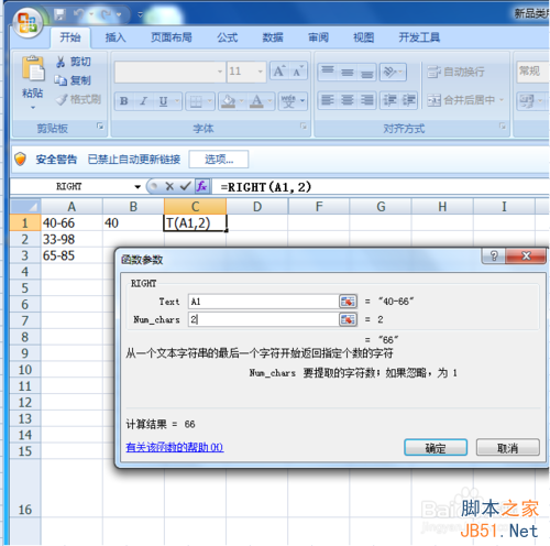 5.由right公式操作后呈现出来的结果如图所示,A1是需要分离的单元格,2是指从A1单元格右数的2位字符,结果就是我们看到的66,这个是就这2个公式简单的运用,希望可以帮忙到大家