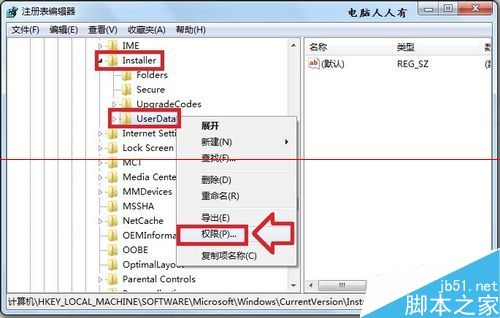 3、依次打开:HKEY_LOCAL_MACHINE\SOFTWARE\Microsoft\Windows\CurrentVersion\Installer\UserData,然后右键点击UserData▶权限