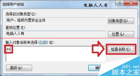 5、然后在 输入名称对象选择 中输入ev▶再点击检查名称。