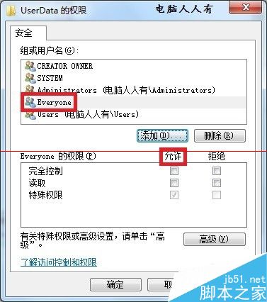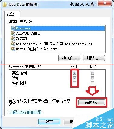8、点击允许下的完全控制和读取选项(务必选中对勾)▶确定,再点击底下的高级进行设置。