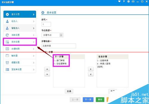 3、双击流程图中的“1、出差申请”,进入如下图所示的步骤设置界面,我们可以看到此步骤可以转交到“2、部门审核”和“3、总经理审核”。点击左侧边栏的“条件设置”。