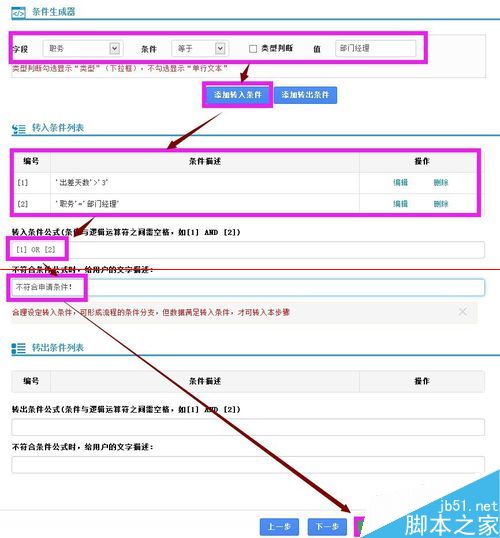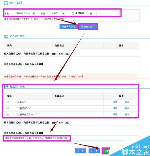 具体操作:“条件生成器”中将‘职务’设置为‘等于’‘部门经理’,‘出差天数’‘大于’‘3’。然后点击“添加转入条件”,将“转入条件公式”设置为“[1]OR[2]”,并设置文字描述后点击“保存”按钮保存设置。
