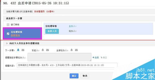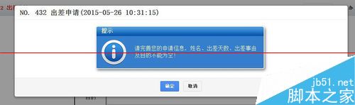 5、到工作流中新建一个出差申请,比如我们不填姓名、职务、出差天数或出差事由及目的中的一个,“转交下一步”时会提示我们自定义的文字描述。
