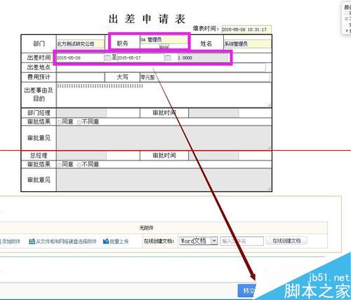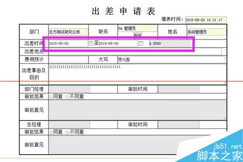4、此处我们要求申请人姓名、职务、出差天数以及出差事由及目的是必填的。