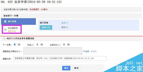 7、新建一个出差申请流程,在表单中将职务和出差天数填入不符合“3、总经理审核”转入条件的内容,“转交下一步”后,我们可以看到总经理审核是“条件不符”的,无法选择这一步。