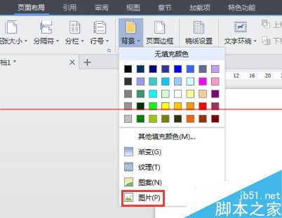 4、点击上方菜单栏里的【页面布局】,找到【背景】选项按钮,点击背景选项按钮弹出下拉菜单,下拉菜单里可以看到【图片】选项,如下图所示。