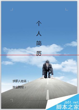 7、接下来在文档内输入个人简历字样,可设置居中显示,下方可以输入求职者姓名及毕业院校等信息,一张简单的个人简历封面就做好了。如下图所示。