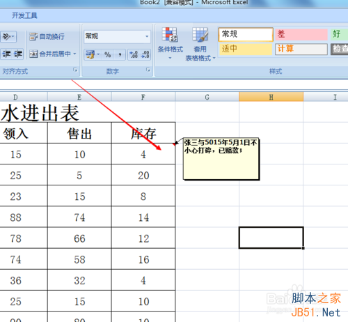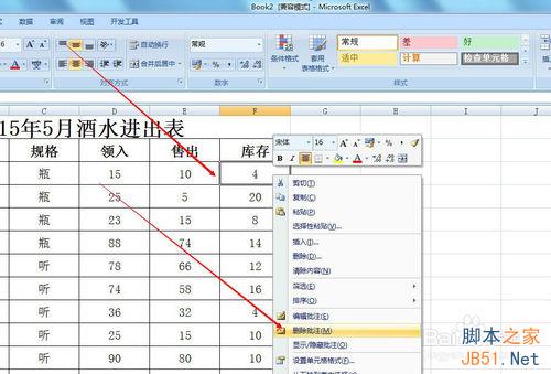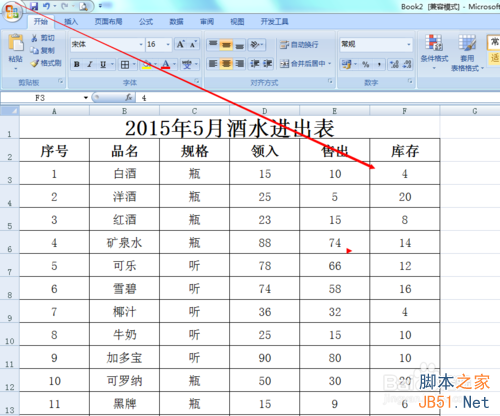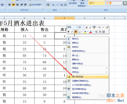 2、打开这个表之后,我们随便举个例子,如图箭头所指的地方,白酒领入15瓶,售出10瓶,应该余5瓶,但报表只余4瓶,原因是被员工打碎了一瓶,所以我们就要用到批注,备注原因了;