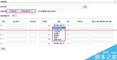 这个列表控件其实是不经常用到的。起作用是相同格式记录的动态输入,可以根据实际需要灵活新增行数录入相应数据。使用这个控件,是可以设置好列表头。列表控件支持多种输入类型,包括单行输入框、多行输入框、下来菜单、单选框、复选框和日期,满足多方面的需求;而且支持自动计算和合计,使用通用运算符+、-、*、/、%等,可以实现列表项目的自动计算输入。其中列表计算项目是不可人工输入的。