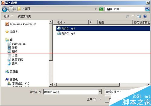2、在打开的文件选择框中,选择你要插入的第一个音频文件
