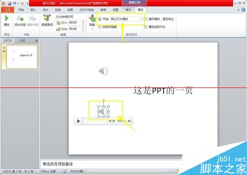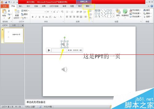 3、插入成功后,会在PPT中显示喇叭图标代表刚才插入的文件,可进行播放试听,进行音量调整,以控制其在PPT放映过程中的音量大小