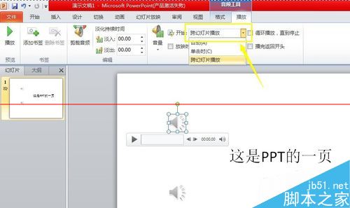 6、在工具栏中的开始中,选择“跨幻灯片播放”,将此音频设置成在每个幻灯片中都播放,不需要人为干预。