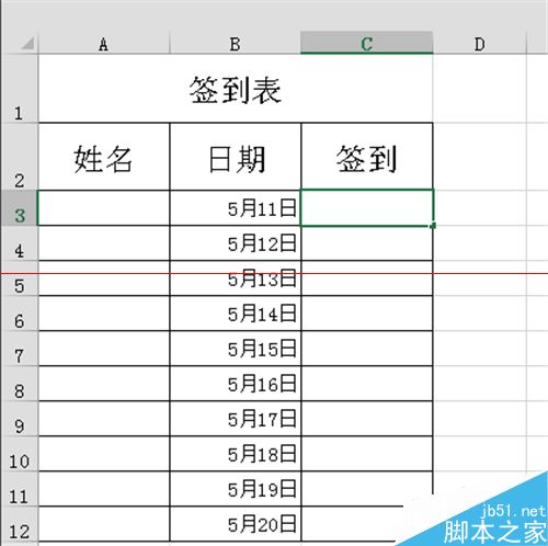 1、打开签到表,可以看到有三列内容,分别是“姓名”、“日期”、“签到”。要在签到一栏中输入"√"和"×",代表已经签到和未签到。