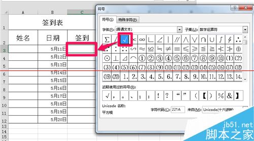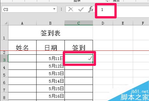 7、返回excel界面,在单元格中输入“1”,回车后,就可以看到签到栏中已经输入了"√"。
