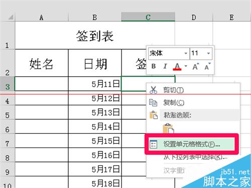3、一个一劳永逸的方法是:在“签到”列中某一单元格右击鼠标,在弹出的快捷菜单中选择“设置单元格格式”。