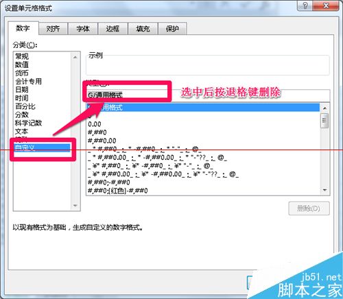 5、选择“自定义”,在右侧的类型中选中“通用格式”并按退格键删除。