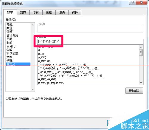 6、然后在类型中输入:[=1]"√";[=2]"×" 。里面的"√"和"×",可以先在单元格中按插入的方法得到,再粘贴到自定义格式框中。