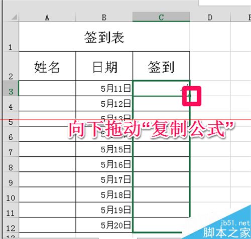 8、接下来,还需要把这个设置复制到似有的“签到”列的单元格中,单击已经设置好格式的单元格,在单元格的右下角出现小方块,拖动鼠标左键向下,将格式复制到全部"签到“列中。现在就大功告成了。