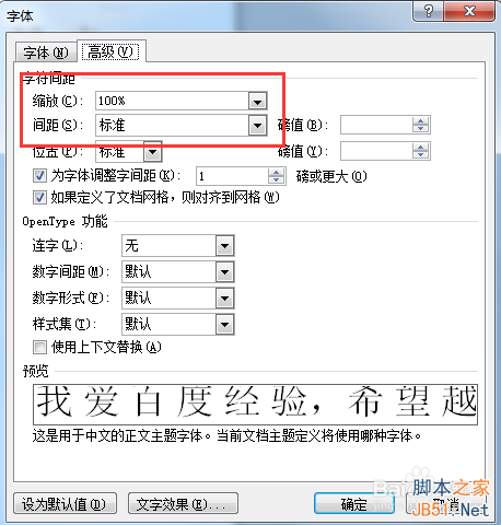进入“高级”界面,在“字体间距”项将 缩放设置为100% ,间距设置为 标准