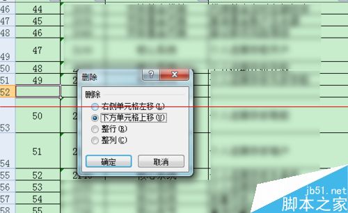 5、在弹出框里选择下方单元格上移,这样就相当于所有序号都上移了一格,但是对其他列没有影响