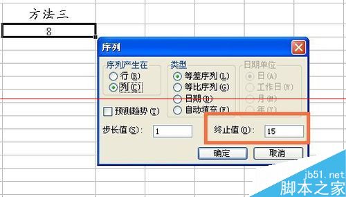3、在弹出的“序列”提示框中对要填充的数据进行设置,可设置“终止值”,点击确定。