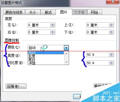 3、本次主要对“图像控制”进行调节,“图像控制”中包含颜色、亮度和对比度选项。“颜色”选项中包含自动、灰度、黑白和冲蚀;“亮度”和“对比度”主要进行百分比调整。