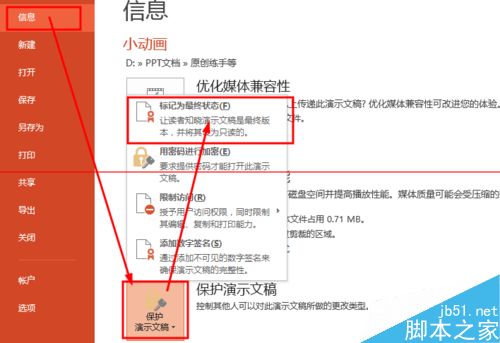 4、单击“保护演示文稿”图标后会出现一些选项,选择“标记为最终状态”