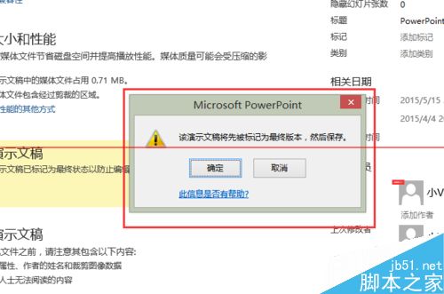 5、此时,会弹出对话框,提示该文档将先被标记为最终版本,然后保存。单击“确定”即可完成设置。