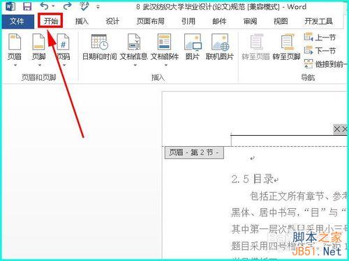 3、单击菜单栏中的“开始”选项:选中页眉中的文字后,我们要在文档的菜单栏找到并单击“开始”选项其位置见下图红色框选中处。