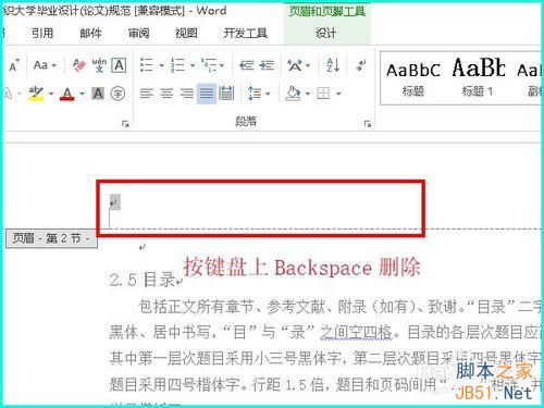 5、敲Backspace键删除页眉内容:页眉内容移至左侧后下面我们只需删除页眉即可,此时我们需要单击键盘上的Backspace键页眉的内容就可删除。