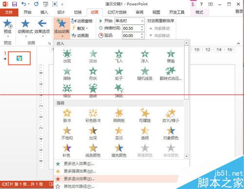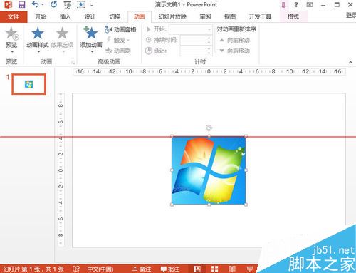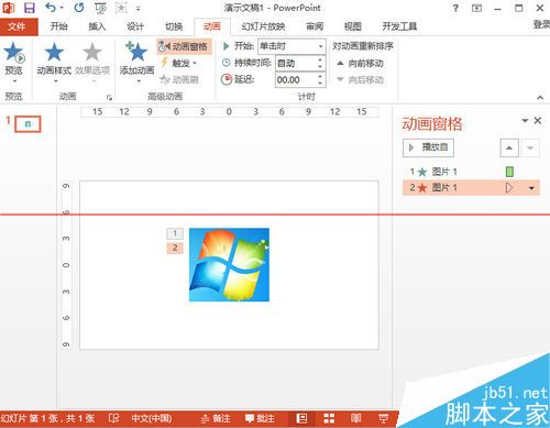 PPT2013 为一张图片设置先后不同的动画效果。这里以一张图片,先飞入再消失为例。