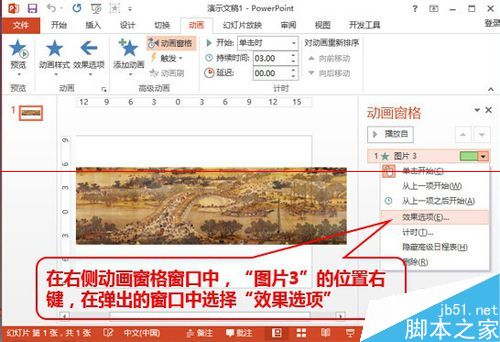 6、在右侧动画窗格窗口中,“图片3”的位置右键,在弹出的窗口中选择“效果选项”