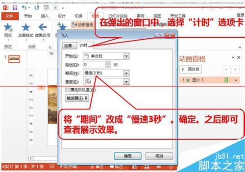 7、在弹出的窗口中,选择“计时”选项卡,将“期间”改成“慢速3秒”。确定。之后即可查看展示效果。