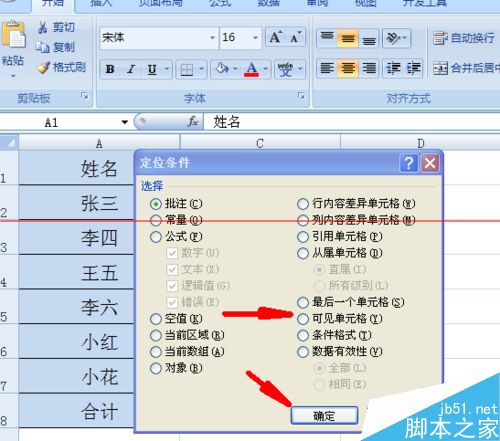 3、选择定位条件之后又会弹出一个对话框,此时我们会发现对话框上会有一个“可见单元格”选项,单击该选项,然后再单击“确定”按钮。