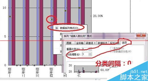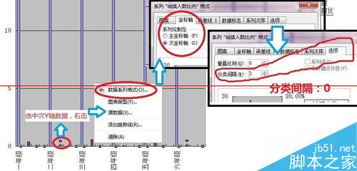 4、选中→主Y轴数据→右击→数据系列格式→选项→分类间隔:0